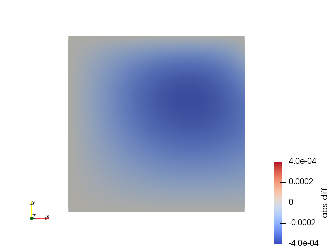 The absolute difference between the analytical and numerical solutions is smaller than $4 \cdot 10^{-4}$: