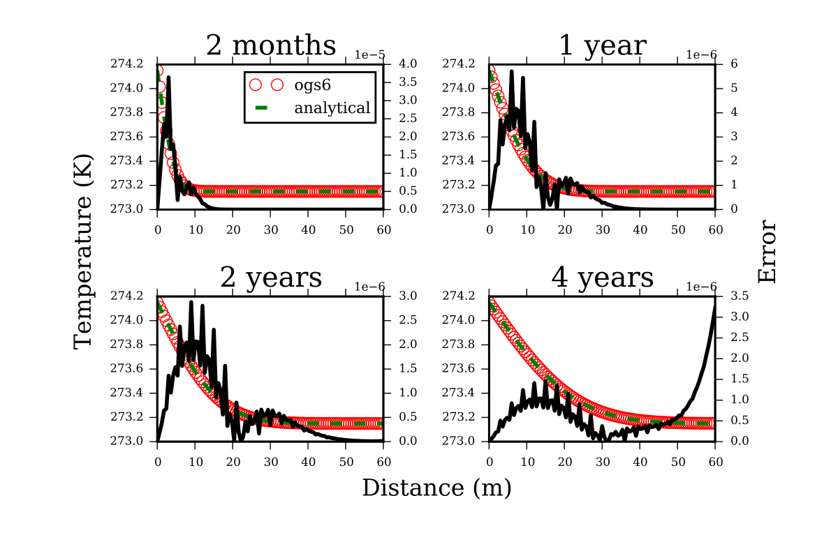 $$ \begin{equation} T(x,t) = T_\textrm{b} \textrm{erfc}(\frac{x}{\sqrt{4\alpha t}}), \end{equation} $$where $T_\textrm{b}$ is the boundary temperature, $\textrm{erfc}$ is the complementary error function and $\alpha = \lambda/(C_p \rho)$ is the thermal diffusivity.