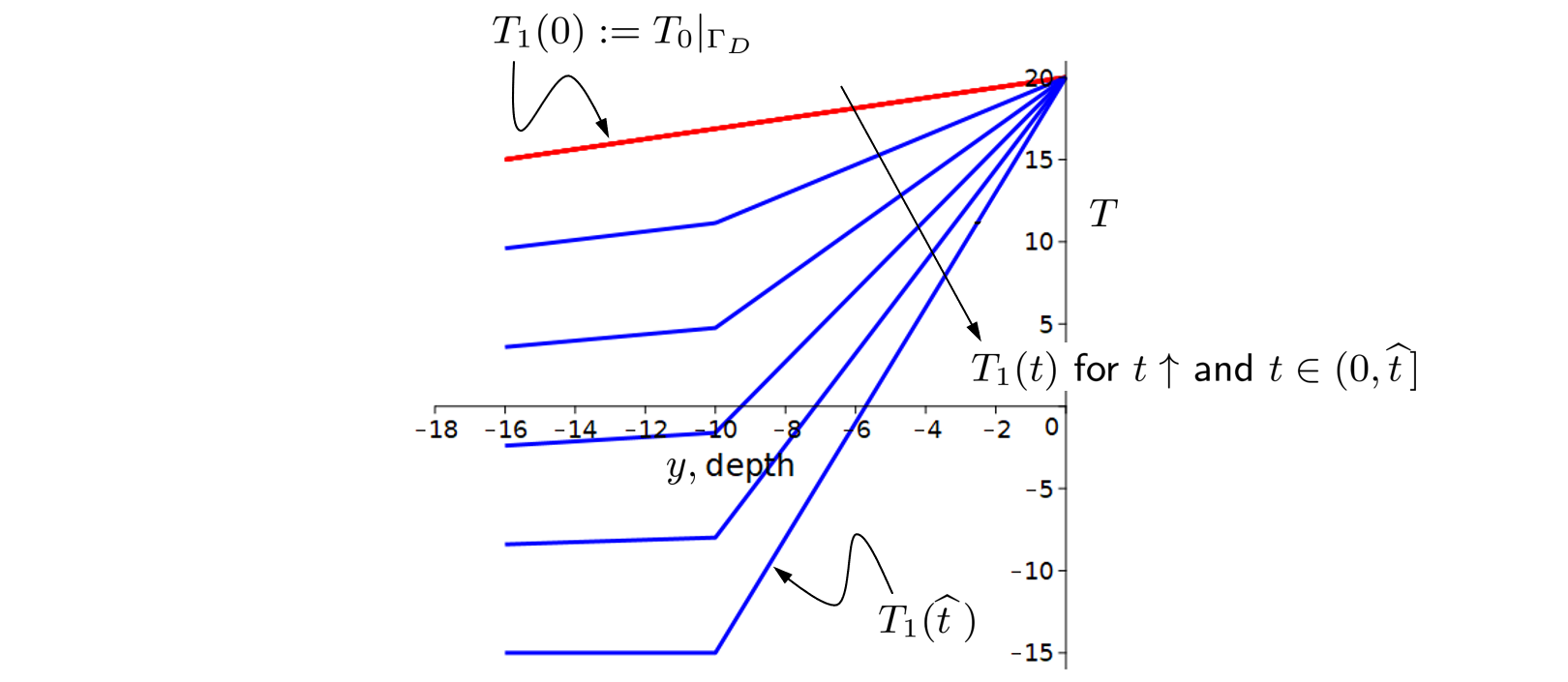 Note that $(r,z)\in S$ are denoted as $(x,y)$ which are assumed to be unrelated to the coordinate notations in the original 3d formulation. 2. The initial condition for $T$ in $S$ is assumed to be a positive function which decays linearly from surface to bottom. For modeling the (time-dependent) boundary conditions on $\Gamma_D$ of $S$, it is assumed that within the first $\widehat{t}$ hours, the temperature on $\Gamma_D$ drops continuously from the initial state to the values prescribed by some continuous piecewise linear function of $y$ and such that at the last depth segment it becomes negative. (The latter mimics the impact of the BHE refrigerant with sub-zero temperature.) The figure sketches the situation: