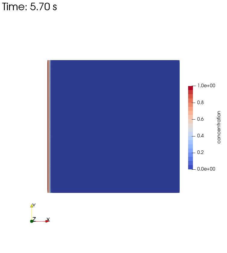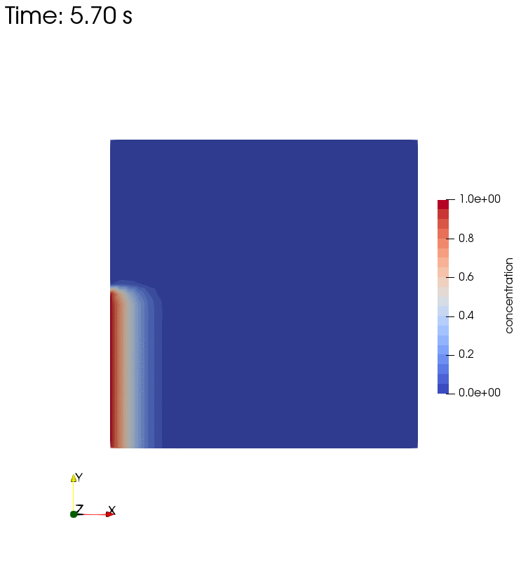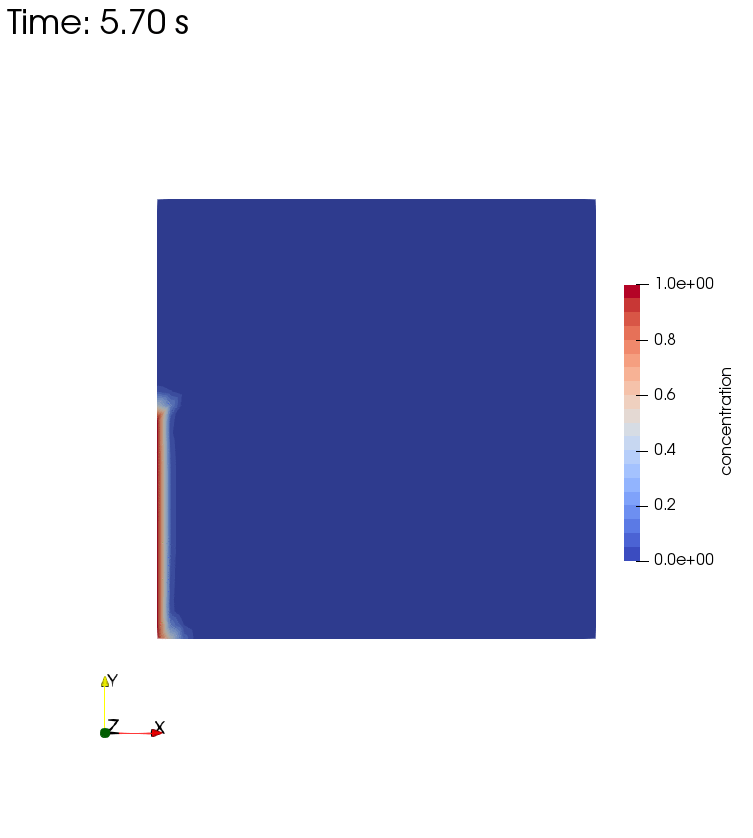 Left side boundary conditions for this setup are pressure $p=1$ and concentration $c=1$. Decay rate is $\theta = 0.001 s^{-1}$.