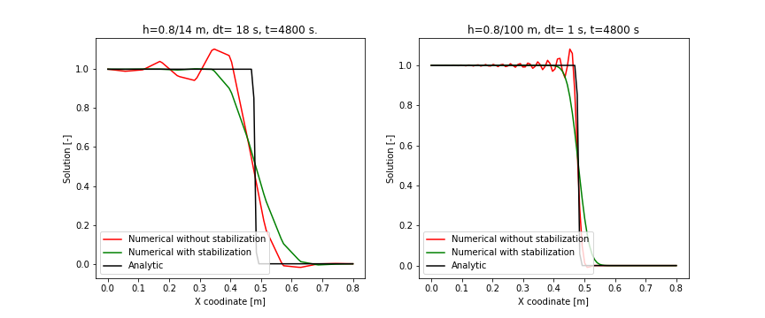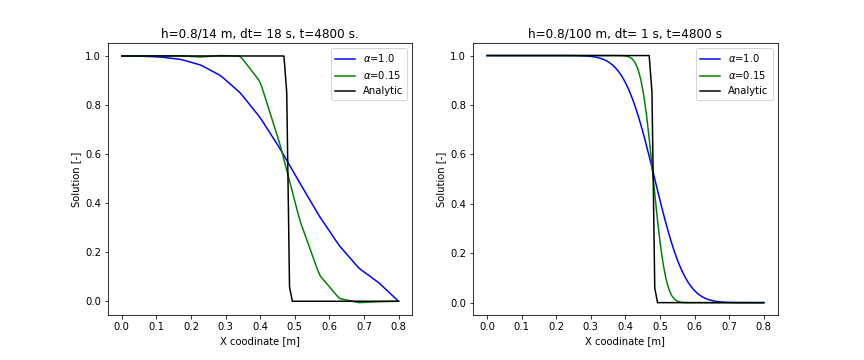 The domain size is 0.8 m. The initial value of the primary variable is 0. The Dirichlet boundary conditions are applied on the left and right boundaries with respective values 1.0 and 0.0. The constant velocity is 1.e-4 m/s. The diffusion coefficient is $10^{-9}$ m/s. The analysis duration is 7200 s.