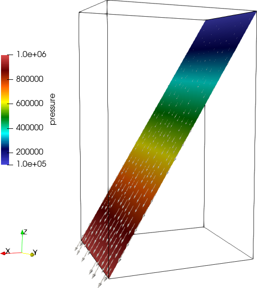 The input files are given in the sub-directory of FractureIn3D. This benchmark tests the case of the mesh contains both 3D elements and inclined 2D element. The analysed domain has two intersected fractures. The brick shape domain is discretised into tetrahedra, while the two planes are discretised into triangles. The permeability of the continuous domain is