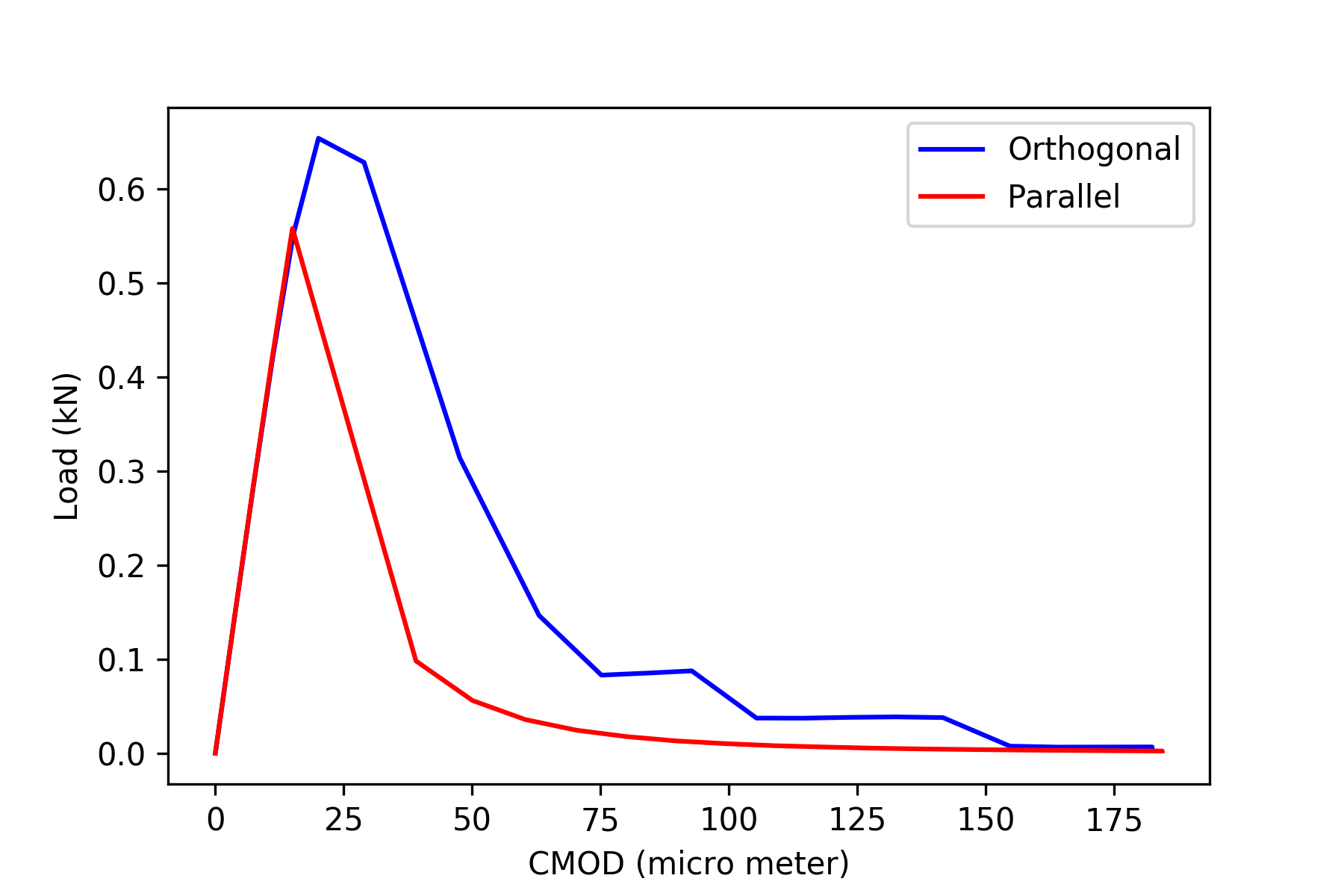 The responses of crack mouth opening displacement (CMOD) vs. force is as follows.