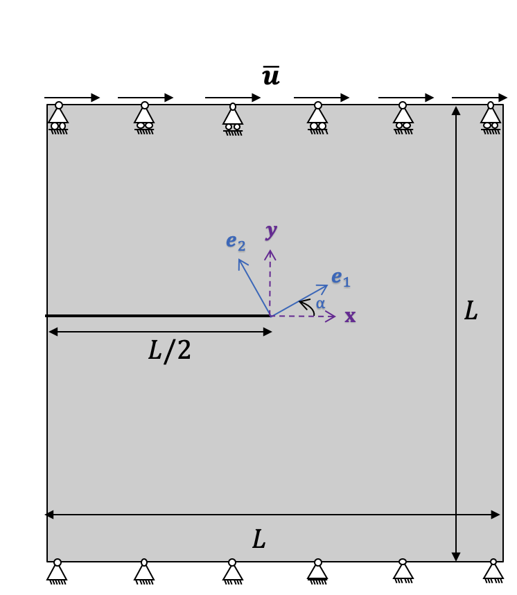 We consider a square plate with an initial horizontal crack placed at the middle height from the left outer surface to the center of the specimen. Plane strain condition was assumed for sake of less computational costs. The user is free to choose either $\texttt{AT}_1$ or $\texttt{AT}_2$ as for the phase field model.