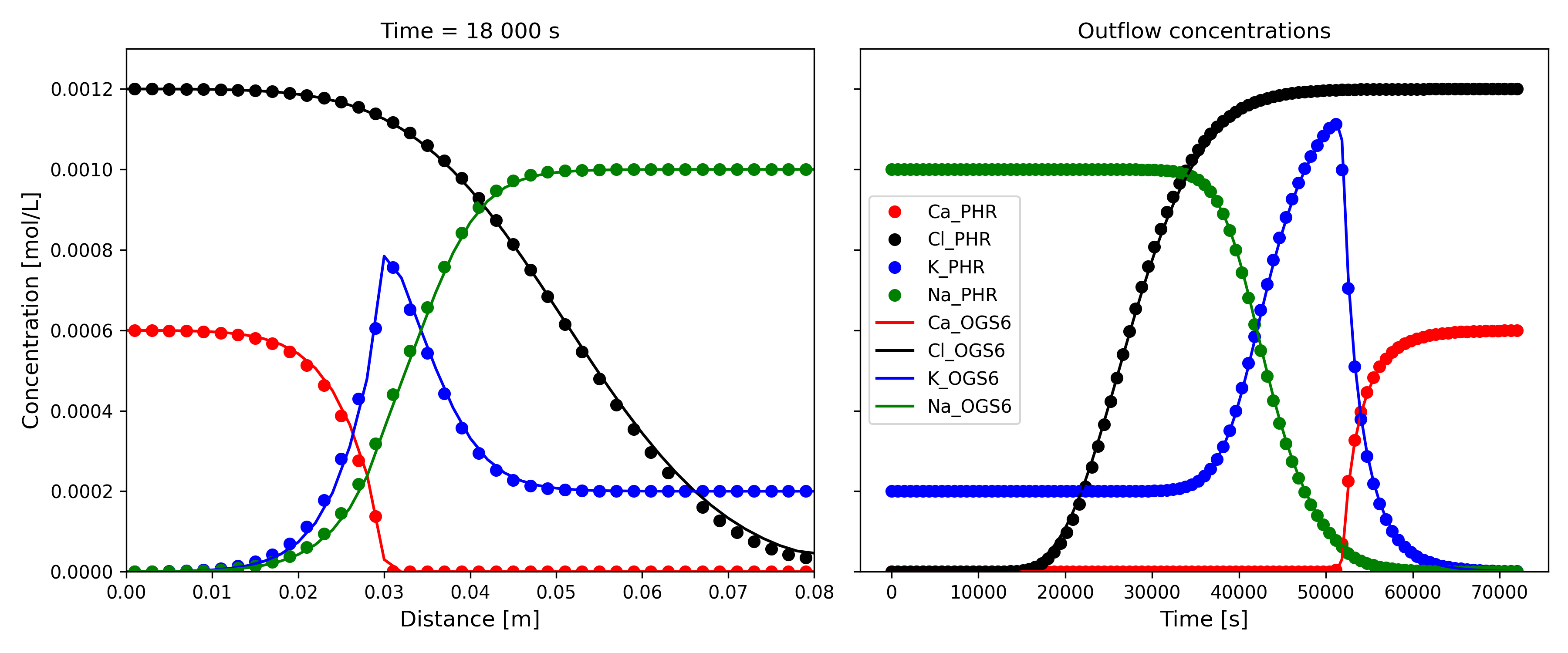 The benchmark uses the ComponentTransport process in OGS-6 coupled with the IPhreeqc software (Parkhurst et al. 2013). The results show good agreement between codes. More details about the implementation of the ComponentTransport process in OGS-6 can be found in HC-Process.pdf.