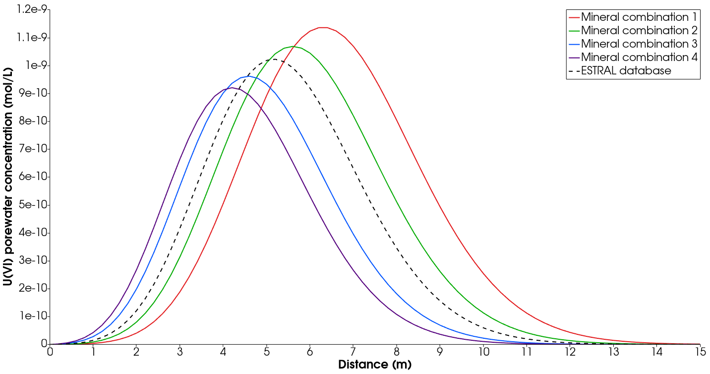 Four different combinations can be simulated taking the albite and orthoclase phases of the Feldspars group and the goethite and hematite phases for the Fe(III)-oxids/-hydroxids group. Mineral combinations from 1 to 4 (see Fig. 2) are as follows: 1) albite-goethite, 2) albite-hematite, 3) orthoclase-goethite and 4) orthoclase-hematite. From the concentration profiles in Fig. 2, it is clear that the combination 2 approximates better the profile obtained with the ESTRAL database. We choose this combination for the next part of our simulations. Furthermore, this combination is written in the RadionuclideSorption.prj file of this benchmark.