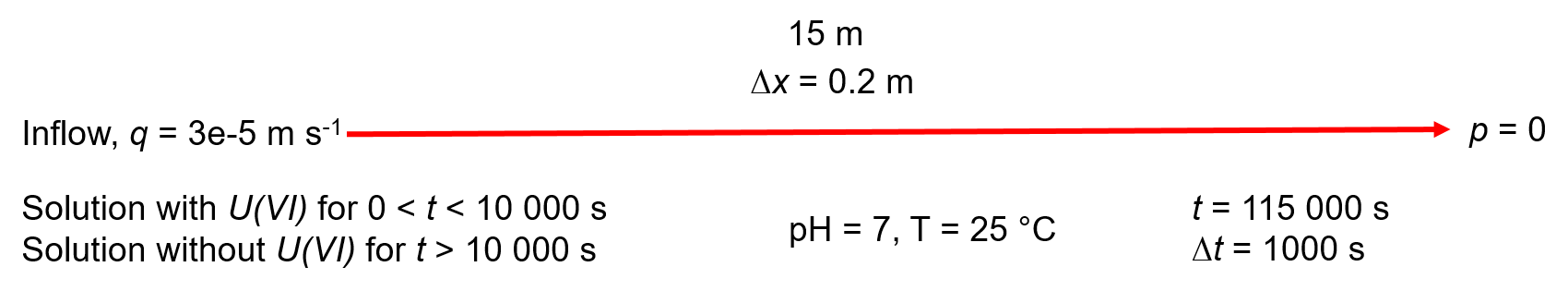 This benchmark is focused on the simulation of the migration of $U(VI)$ in a porous media. An important chemical process happening is the surface sorption, which favors the retardation of radionuclide migration. Therefore, it is necessary to quantify its overall impact on the transport. We use a Surface Complexation approach as a mechanistic model to describe the chemical reactions happening at the solid surface. The surface reactions considered in this benchmark were added to the PSI/NAGRA chemical thermodynamic database version 12/07 (Thoenen et al., 2014) for the speciation calculations. A schematic representation of the 1D model with relevant parameters is shown in Fig. 1. A permeability = $1.019368 \times 10^{-11}~m^2$, porosity = $0.2$, molecular diffusion coefficient = $1.0 \times 10^{-9}~m^2/s$, longitudinal/ horizontal/ vertical dispersivities = $0.2~m$, tortuosity = $1$, density = $1000~kg/m^3$ and viscosity = $1\times 10^{-3}~kg~m^{-1} s^{-1}$ are the input parameters of the porous medium.