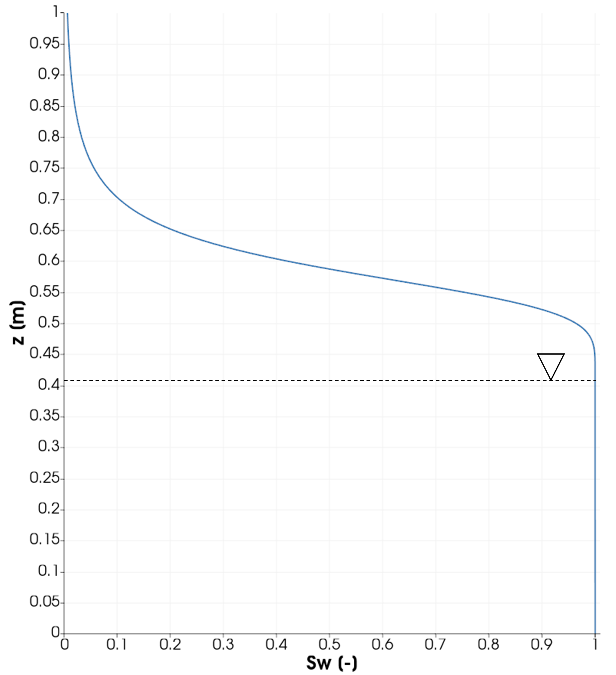 The model domain is 1-D in the vertical direction with a length of 1 m. The initial saturation profile is at steady state and shown in Fig. 1. The groundwater table is fixed at $z=0.407$ m by assigning a Dirichlet boundary condition of the gas pressure at $z=0$ m. The top boundary ($z=1$ m) is open with $P_g=101,325$ Pa. Initially, there is no TCE in the domain. A constant TCE molar fraction of $X^c=1\times10^{-6}$ is imposed below the water table (i.e. across the entire depth of the saturated zone), while null TCE concentration is assumed at the top boundary ($z=1$ m). A constant temperature of 298 K is maintained everywhere. The parameters of the numerical model are listed in Table 1.