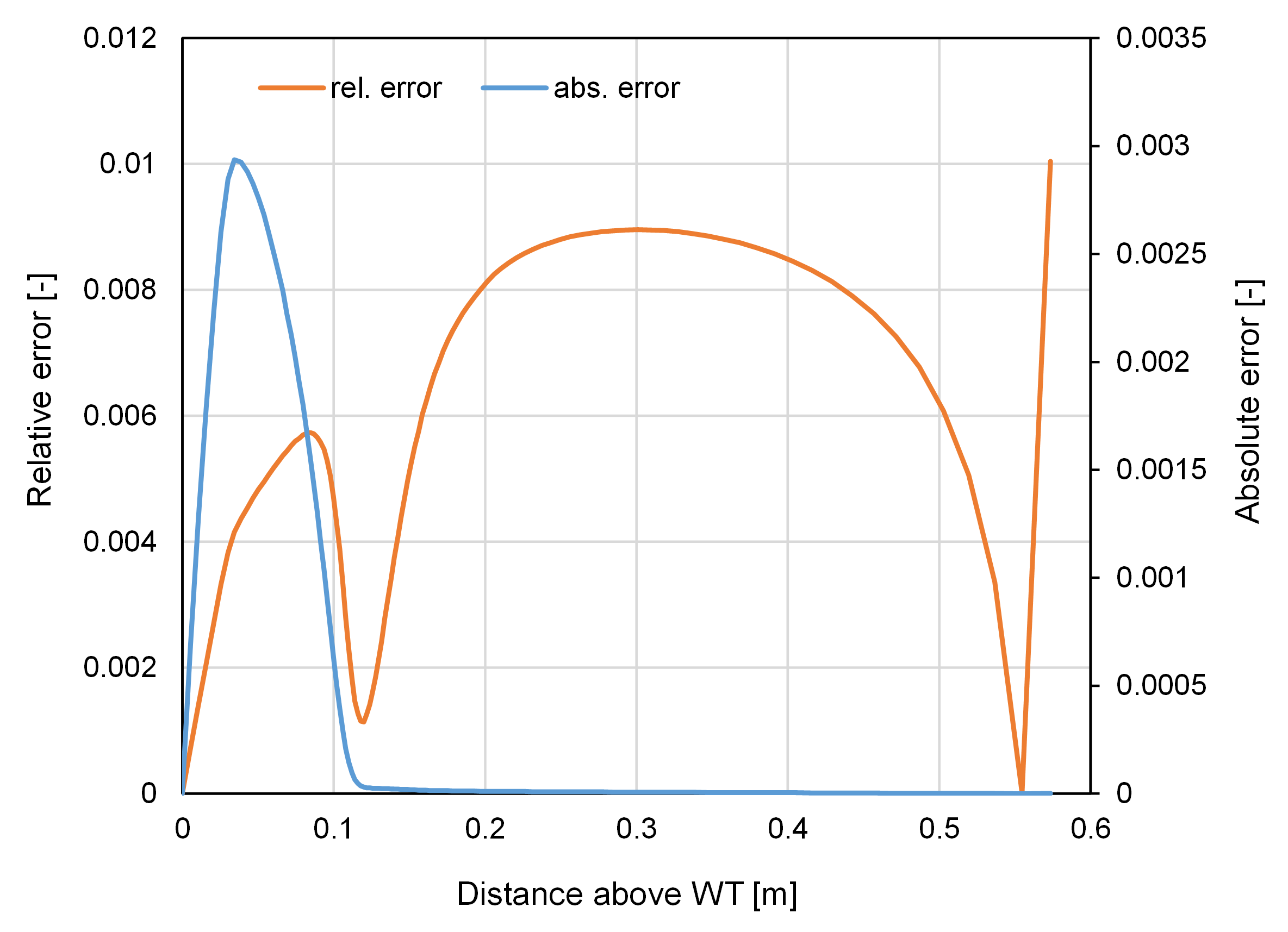 Figure 2 compares the normalized gas phase TCE concentration profiles given by the numerical model and the above semianalytical solution at steady state. Figure 3 shows the absolute and relative errors between the two curves in Fig. 2. The maximum relative error is less than 1% except one point. Thus, a very good agreement was obtained. It is interesting to note the sharp decline of the TCE concentration immediately above the water table, which is due to the several orders of magnitude difference between $D_{0a}$ and $D_{0w}$.