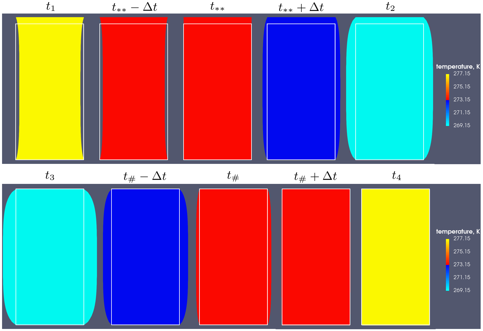 Figure 3 presents snapshots of a specimen’s deformed configuration at the time moments as in Figures 1 and 2. The fill corresponds to specimen’s temperature, and a white frame stands for the undeformed configuration to highlight deformation shape and magnitude. (We notice that in each plots the computed displacement components $u_x$ and $u_y$ have been exaggerated by factors 10 and 80, respectively). The deformation plots supplement and illustrate the above observations and conclusions drawn.
