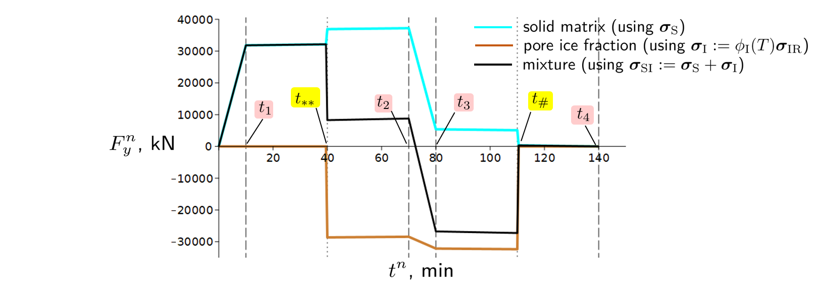 $$ \boldsymbol F^n=(F^n_x,F^n_y):=\int_{\Gamma_\mathrm{top}} \boldsymbol\sigma(\boldsymbol u^n)\cdot\boldsymbol n\\, \mathrm{d}s \quad\text{for $\boldsymbol\sigma \in \\\{ \boldsymbol\sigma_\mathrm{S}, \boldsymbol\sigma_\mathrm{I}, \boldsymbol\sigma_\mathrm{SI} \\\}$}, $$where $\boldsymbol u^n:\Omega\rightarrow\mathbb{R}^2$ is the computed displacement solution vector, and $\boldsymbol n$ is an outward normal on $\Gamma_\mathrm{top}$. The stresses shown in the Figure 2. are: the solid matrix stress $\boldsymbol\sigma_\mathrm{S}$, the pore ice fraction stress $\boldsymbol\sigma_\mathrm{I} := \phi_\mathrm{I}(T)\boldsymbol\sigma_\mathrm{IR}$, and the solid-ice mixture stress $\boldsymbol\sigma_\mathrm{SI}:=\boldsymbol\sigma_\mathrm{S}+\boldsymbol\sigma_\mathrm{I}$.