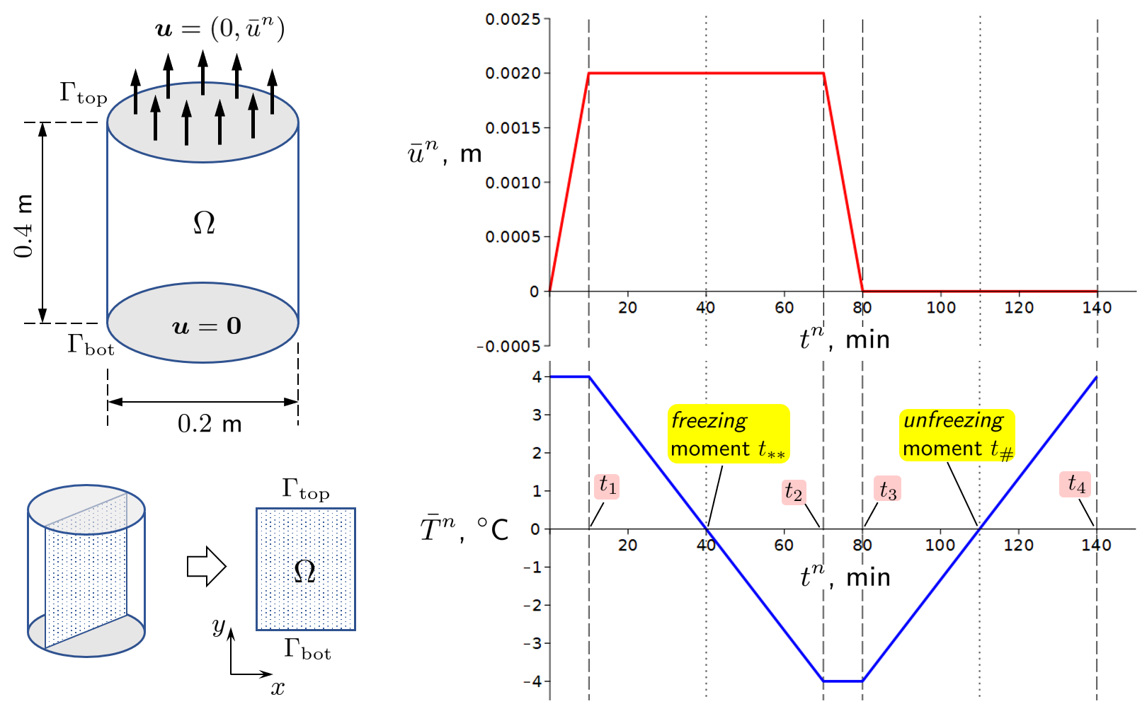 The left plot of Figure 1 depicts geometric and mechanical loading setup: the cylindrical column $\Omega$ is fixed at the bottom edge $\Gamma_\mathrm{bot}$ and the incremental vertical displacement loading $\bar{u}^n$, with $n\geq1$ being a time step, is applied at column’s top boundary $\Gamma_\mathrm{bot}$. Simultaneously, the incremental thermal loading $\bar{T}^n$ is applied within the column. This implies, that all temperature dependent coefficients in the moment balance equation are varied by setting $T=\bar{T}^n$ therein. Figure’s right plot details both $\bar{u}^n$ and $\bar{T}^n$ including the time intervals of interest. The unknown we solve for is the specimen displacement field $\boldsymbol u$. Notice that using the symmetry of the 3-dimensional domain, we effectively consider and solve the 2-dimensional problem in a diametrical cross-section.