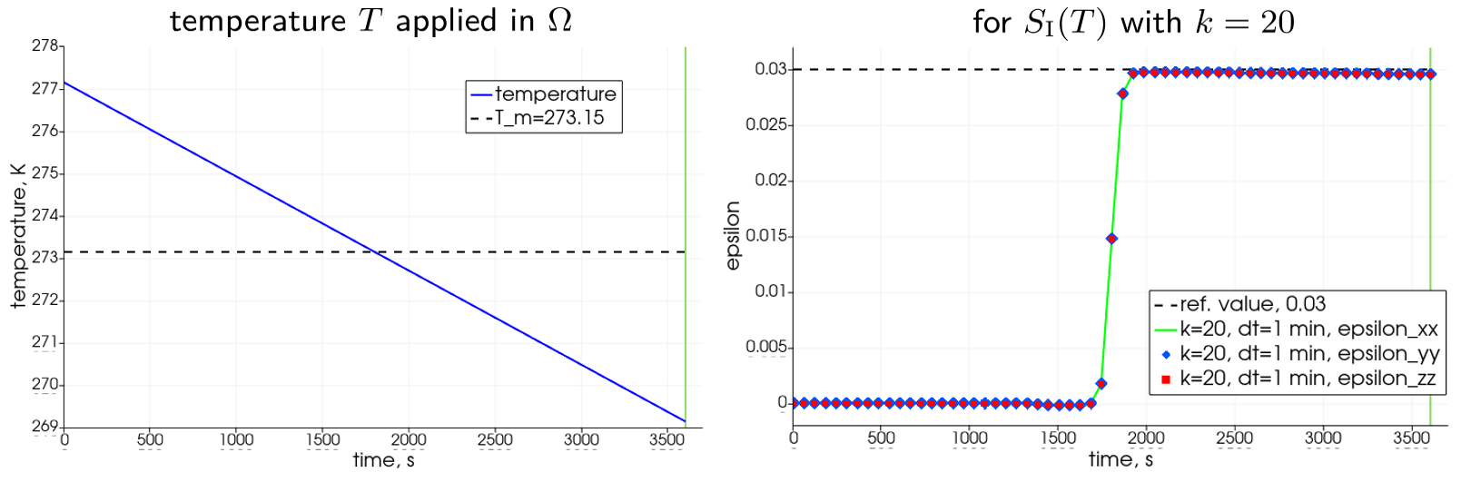 Figure 2, right, depicts evolution of strain tensor components $\varepsilon_{xx}$, $\varepsilon_{yy}$, $\varepsilon_{zz}$ computed for the fixed parametric pair $(\Delta t, k)=(60\\,\mathrm{s}, 20)$. All three strains behave identically and, more importantly, as expected, they transit from 0 to the reference magnitude of 0.03 during the freezing, in accordance to the term $\alpha_{\phi_\mathrm{I}}S_\mathrm{I}(T)$.