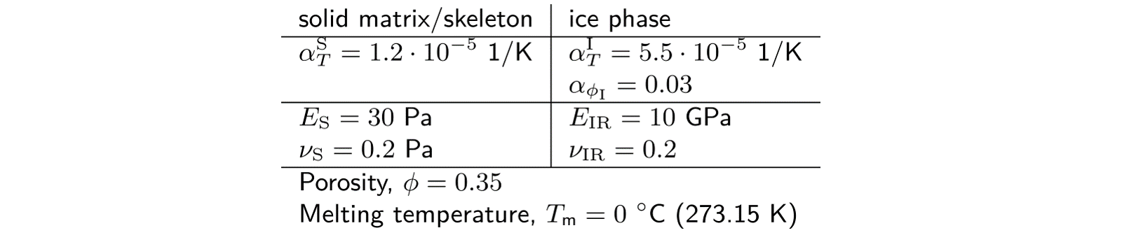 $$ \begin{align*} \boldsymbol\sigma\_\mathrm{SI} :=&\boldsymbol\sigma\_\mathrm{S}+ \boldsymbol\sigma\_\mathrm{I} \\\\\\ =&\mathbb{C}\_\mathrm{S}:\left(\boldsymbol\varepsilon-\alpha^\mathrm{S}\_T (T-T\_0){\bf I}\right) \\\\\\ +&\phi S\_\mathrm{I}(T) \mathbb{C}\_\mathrm{IR}: \left(\boldsymbol\varepsilon-\boldsymbol\varepsilon\_\mathrm{S0} - \alpha^\mathrm{I}\_T (T-T\_\mathrm{m}){\bf I} - \alpha\_{\phi\_\mathrm{I}} S\_\mathrm{I}(T){\bf I} \right), \end{align*} $$where $\mathbb{C}\_\mathrm{S}$ and $\mathbb{C}\_\mathrm{IR}$ are the forth order elasticity tensors of solid matrix and ice phase, respectively, $\boldsymbol\varepsilon$ is the total strain, $\alpha^\mathrm{S}\_T$ and $\alpha^\mathrm{I}\_T$ are the linear thermal expansivities of solid and ice phases, respectively, $\phi$ is the porosity, $\alpha_{\phi_\mathrm{I}}=0.03$ is the linear expansion coefficient due to water-to-ice phase change and, finally, $S\_\mathrm{I}(T)$ is the regularized ice phase indicator function ($S\_\mathrm{I}\rightarrow 1$ is ice, and $\rightarrow 0$ is liquid water). Then the material properties in the benchmark are to be chosen such that $E_\mathrm{S}\ll E_\mathrm{IR}$. In this way, and also with the absence of mechanical loading, the deformation of a specimen — with $\alpha_{\phi_\mathrm{I}}$ being the strain increase in each space direction — will occur solely due to liquid freezing.
