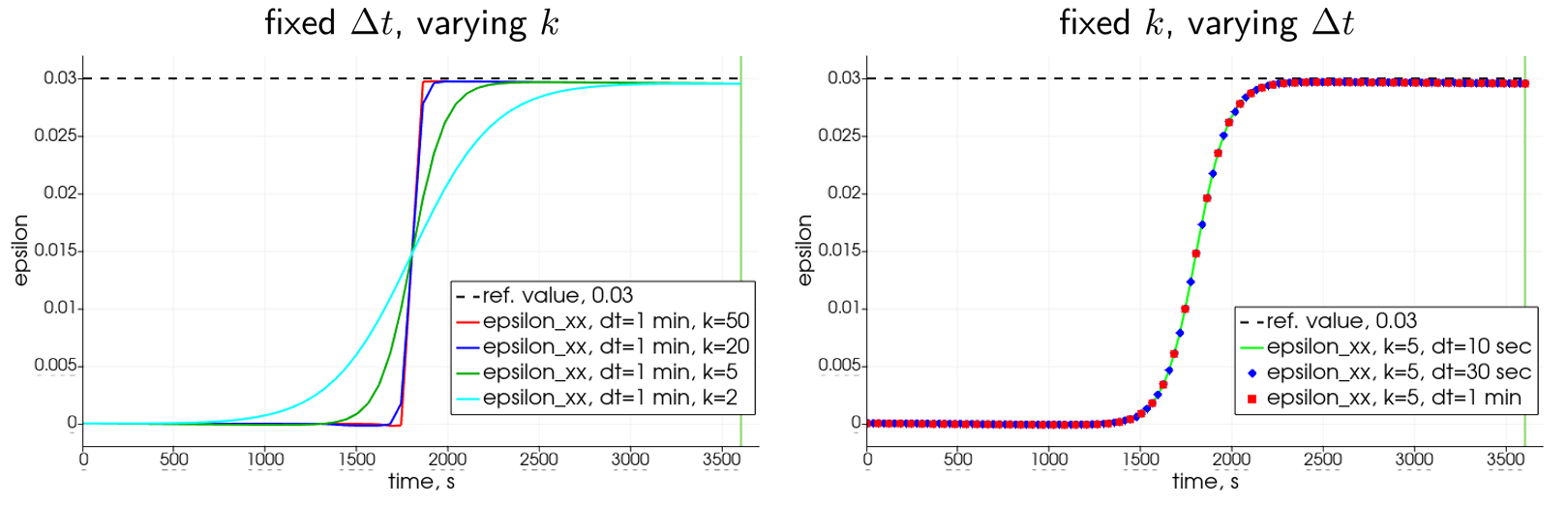 Figure 3 details the parametric studies for the computed $\varepsilon_{xx}$: on the left plot, for the fixed time increment, one observes that for any considered $k$ the corresponding strains transit up to the required value 0.03 and, as also expected, the increase of the parameter yields a steeper and more localized transition zone, almost mimicking the Heaviside-like behaviour at $k=50$. It is interesting to observe a slight downward deviation of $\varepsilon_{xx}$ from the horizontal reference value in the post-freezing time range (that is, when the prescribed temperature keeps on decreasing from $T_\mathrm{m}$ to $-4\\,^\circ\mathrm{C}$). This behaviour is physical and implies the ice contraction in such temperature range. The right plot of Figure 3 presents the evolution of $\varepsilon_{xx}$—specifically, the required transit during the phase change—for a fixed steepness-related parameter $k$ and varying time step size. All three computational results seem identical.