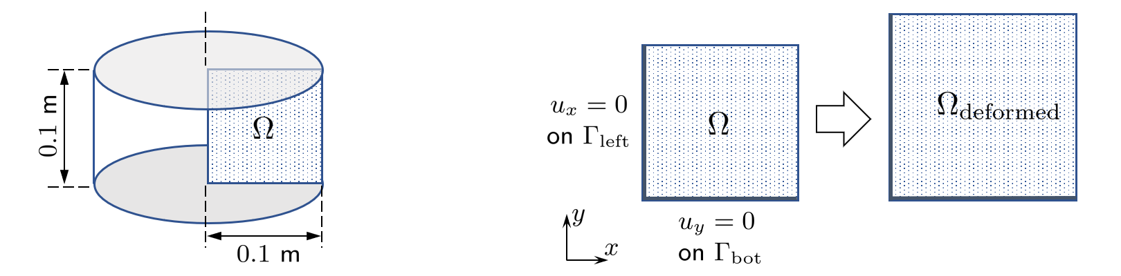 The material properties in the benchmark are to be chosen such that the Young’s modulus of solid is smaller than that of ice, i.e. $E_\mathrm{S}\ll E_\mathrm{IR}$. In this way, and also with the absence of mechanical loading, the deformation of a specimen with $\alpha_{\phi_\mathrm{I}}=0.03$ being the strain increase in each space direction will occur solely due to liquid freezing.