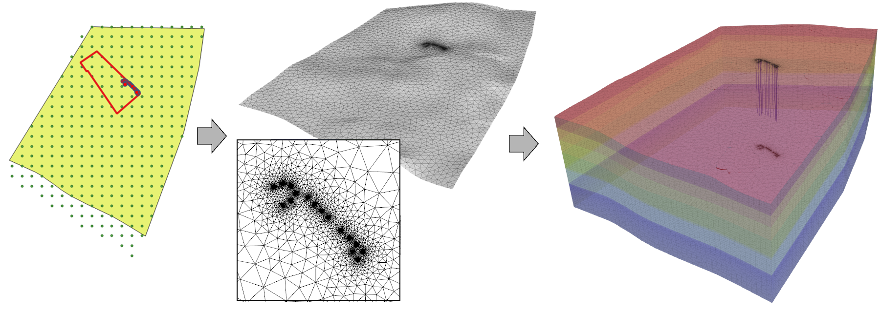 IntegrateBoreholesIntoMesh -i input_3Dmesh.vtu -o boreholes_3Dmesh.vtu -g boreholes_xy.gml --min-id 2 --max-id 4NOTE: If some boreholes are given at the beginning of the meshing process, it is recommended to use the OpenGeoSys DataExplorer – Manual / Download. At first, the nodes for boreholes can be integrated into the mesh, when the mesh is generated from a geometry. For this purpose, the boreholes and the boundaries of the geometry need to be imported in DataExplorer. Then this mesh can be used to create a 3D mesh, either with the DataExplorer or with createLayeredMeshfromRaster, which then can be used for integrating boreholes. This procedure is useful because the mesh is generated in a way that the coordinates of the boreholes are nodes in the mesh. Otherwise the borehole’s coordinates need to be adjusted according to a existing mesh. This process is schematically depicted in Fig.1, below.