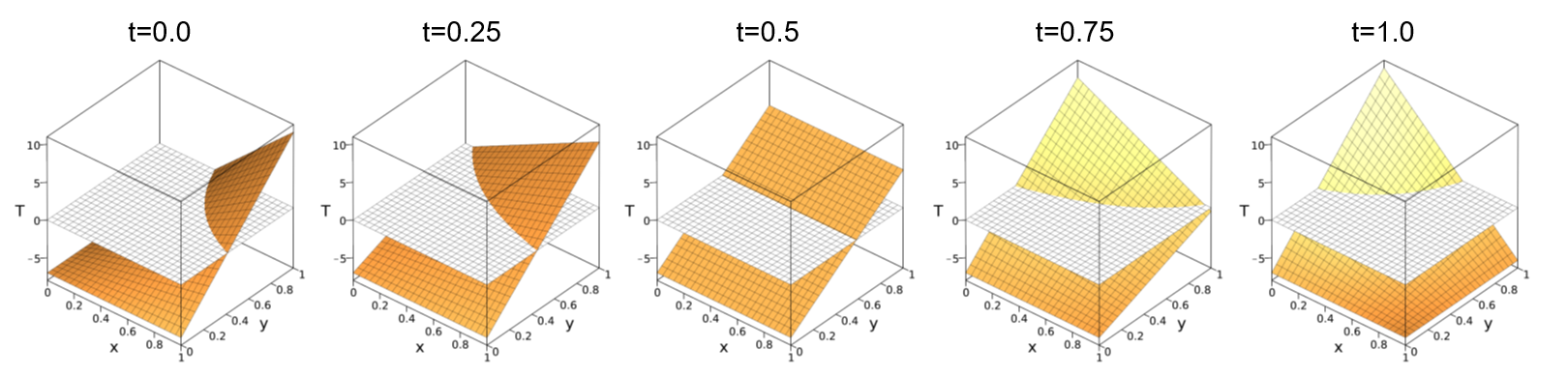 The plane in white color in figure represents zero (melting) temperature in Celsius, such that the zero-level set of $T$ mimics the interface between ice and water fractions which moves in time.