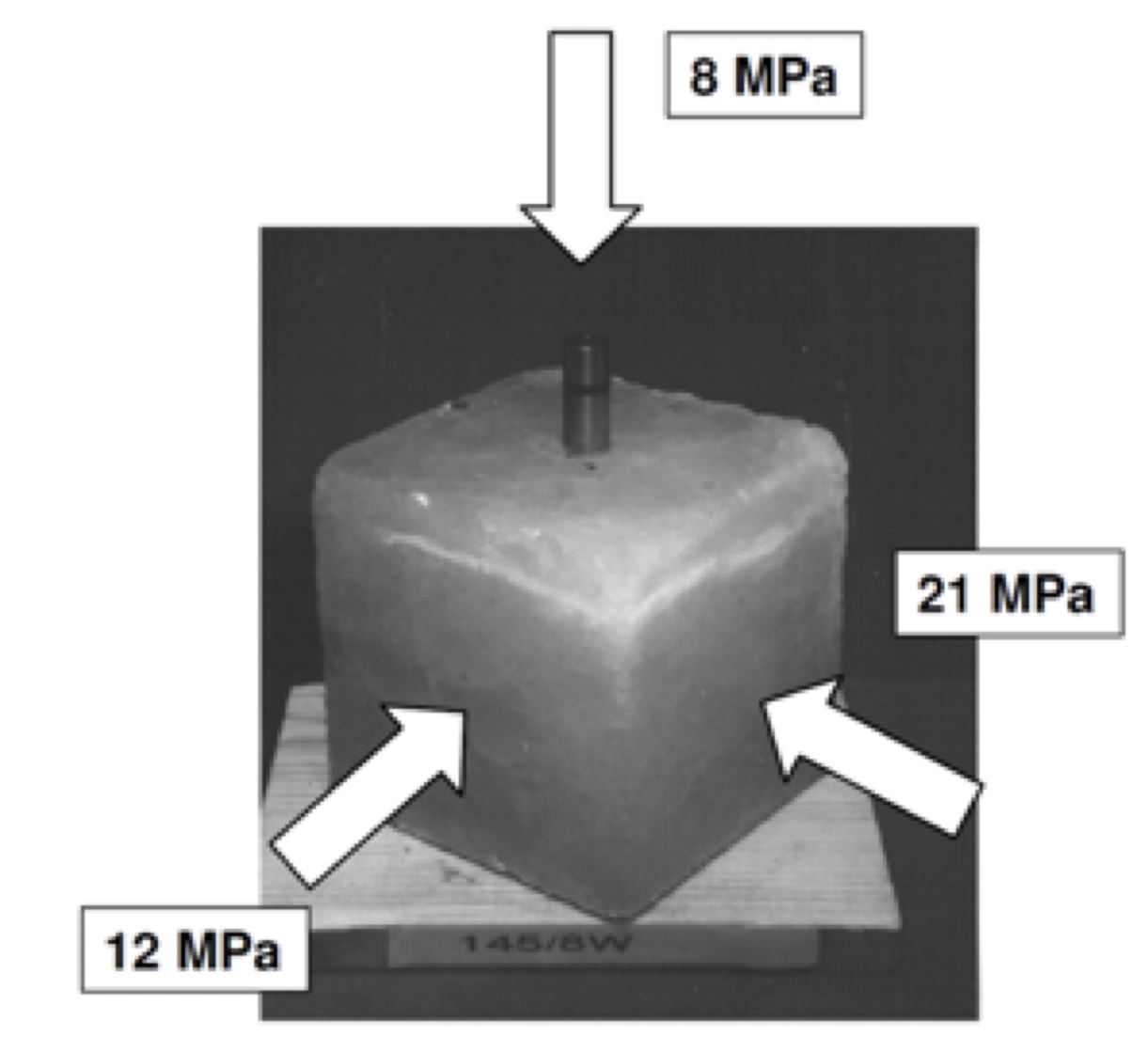 We simulate two different fluid percolation experiments performed on rock salt samples with a true tri-axial loading system as described in this PDF. The experiments were performed under two different stress configurations as below.