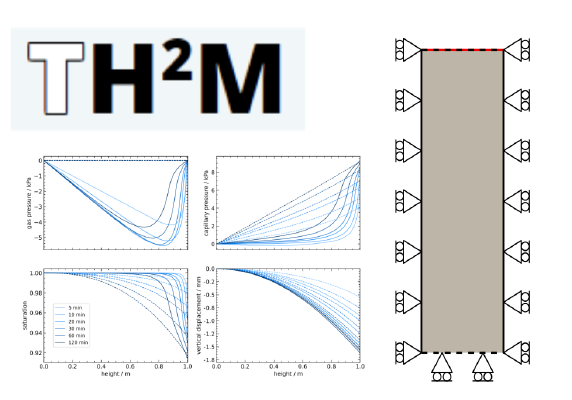 Some of the collected benchmarks for the TH2M process can be accessed here. Since fully coupled benchmarks are very rare, and since the TH2M process is rather complex, part of the benchmark hierarchy presented and described in Grunwald et al 2020 and 2022 is provided here. This hierarchical ordering of test examples reduces the complex system of equations to simpler combinations of the individual physical processes. Each of the reasonable subsets of process combinations is tested against closed-form solutions, the results of physical experiments, or by comparison with other codes.